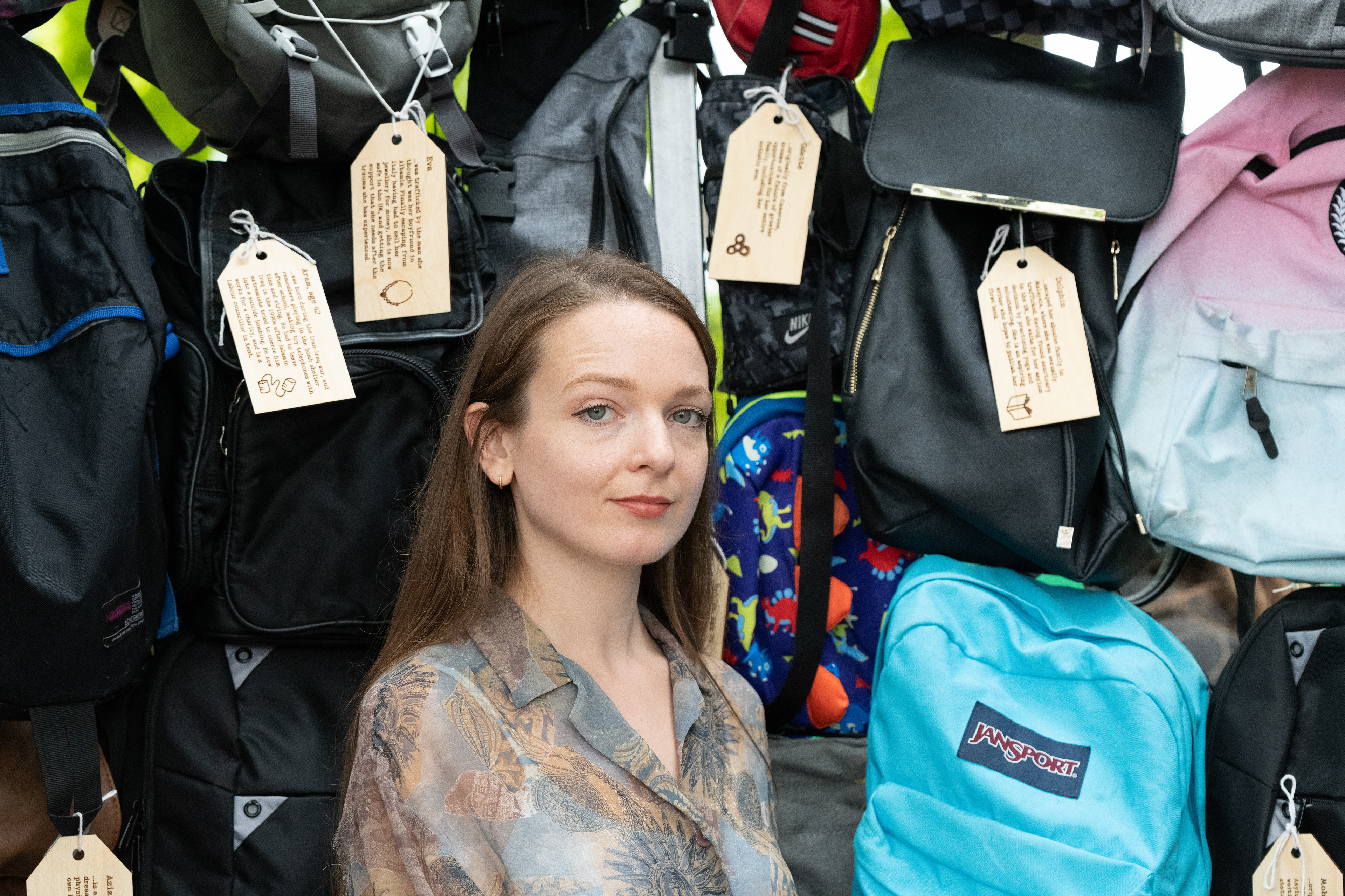 London, UK. 20 June, 2023. Opening of public art work 'Bags of Hope' by Sophie Cunningham, commissioned by charity Migrant Help, comprising a two-metre structure of backpacks with luggage tags telling stories of asylum seekers. Created to mark the UK's Refugee Week the piece is on display on London's South Bank and is designed to encouraging empathy towards people seeking asylum. Commissioner Migrant Help exists to protect people affected by displacement and is this year marking its 60th anniversary.