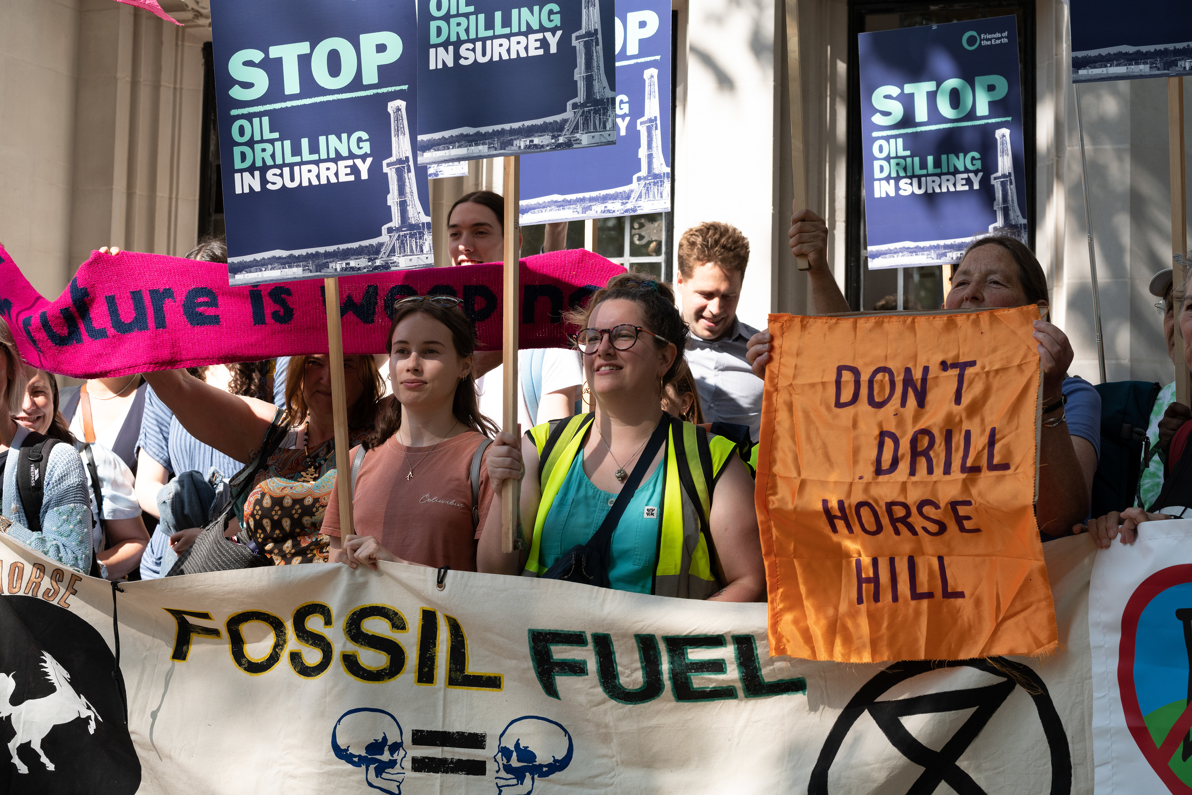London, UK. 21 June, 2023. First day of Supreme Court hearings of a challenge to the decision to allow oil drilling in Horse Hill, Surrey. The challenge asserts that planning decisions must take account of "downstream" emissions and, if allowed, campaigners believe it may have significant impact on future decisions on fossil fuel extraction.