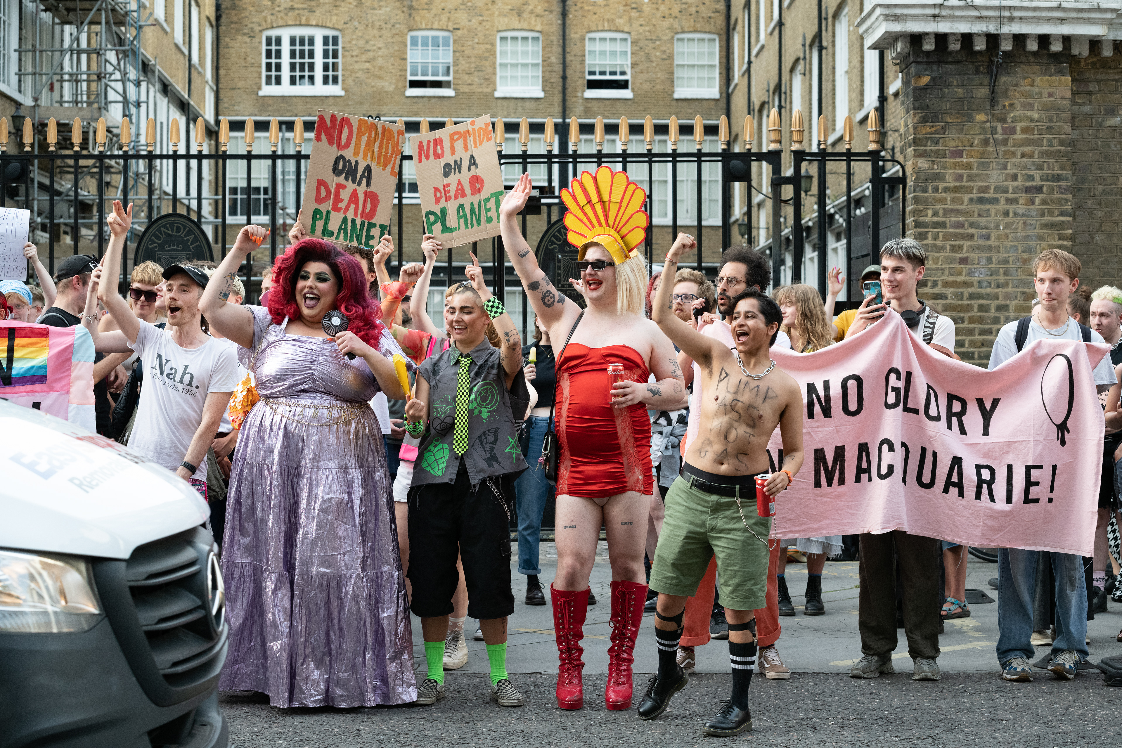 London, UK. 23 June, 2023. Activists from Fossil Free Pride hold a lively protest outside the LGBT Awards ceremony at The Brewery, in the City of London, against corporate sponsors backing the awards. Earlier this week organisers dropped oil companies Shell and BP after several prominent guests announced they would not attend awards backed by what activists call "climate criminals".