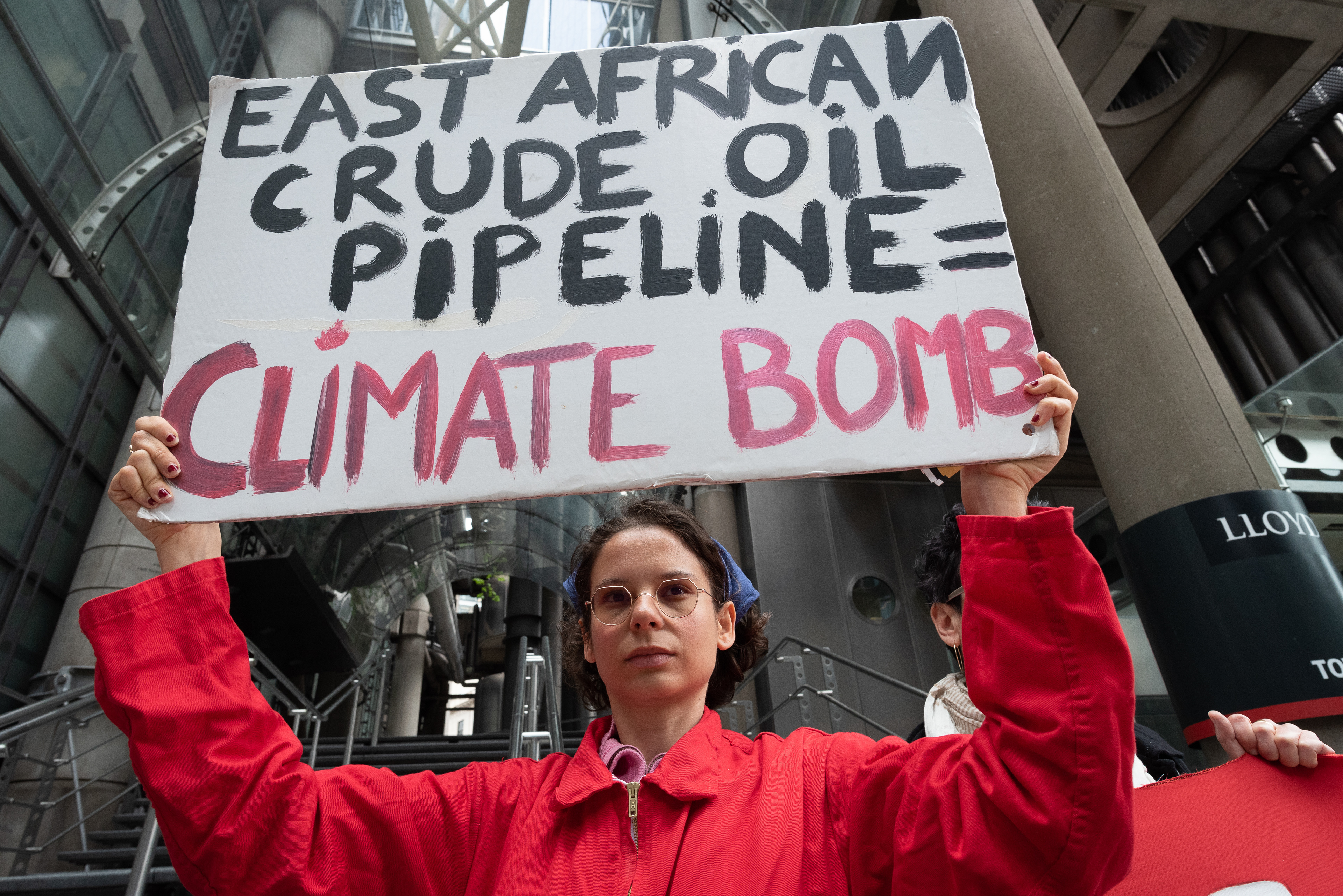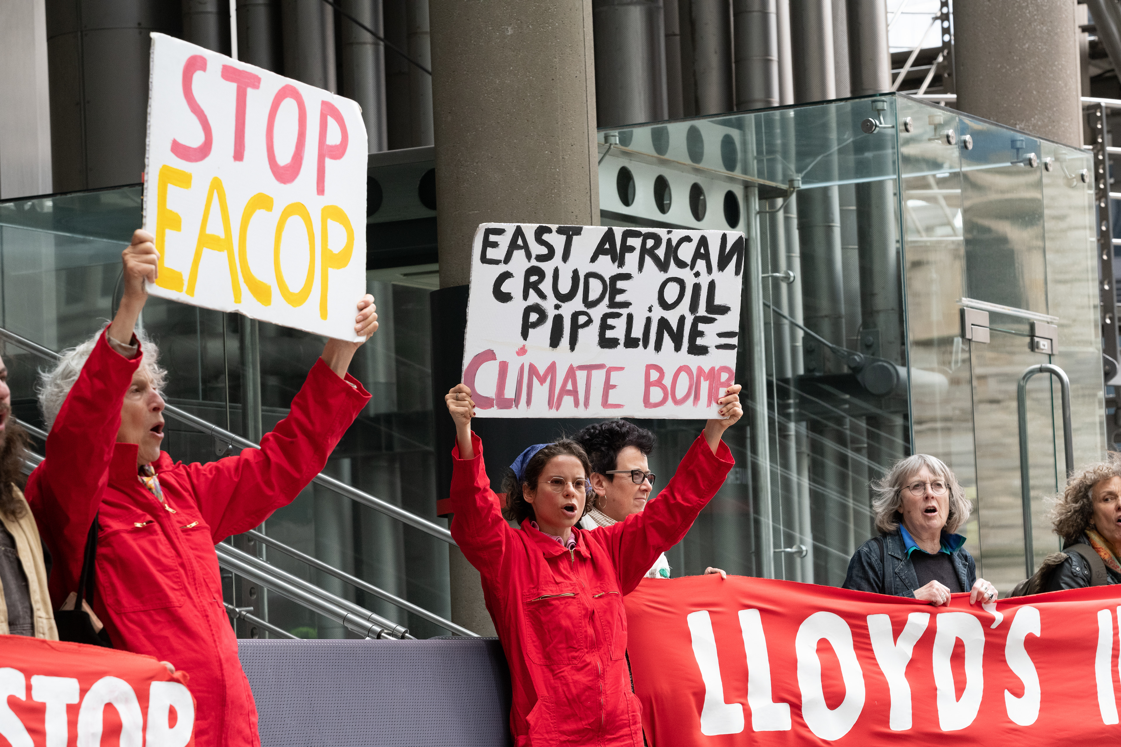 London, UK. 25 May, 2023. Climate activists protest the Lloyd's of London Annual General Meeting, calling on the insurance market to stop underwriting new fossil fuel extraction in order to meet emission reduction targets required to combat the climate emergency.