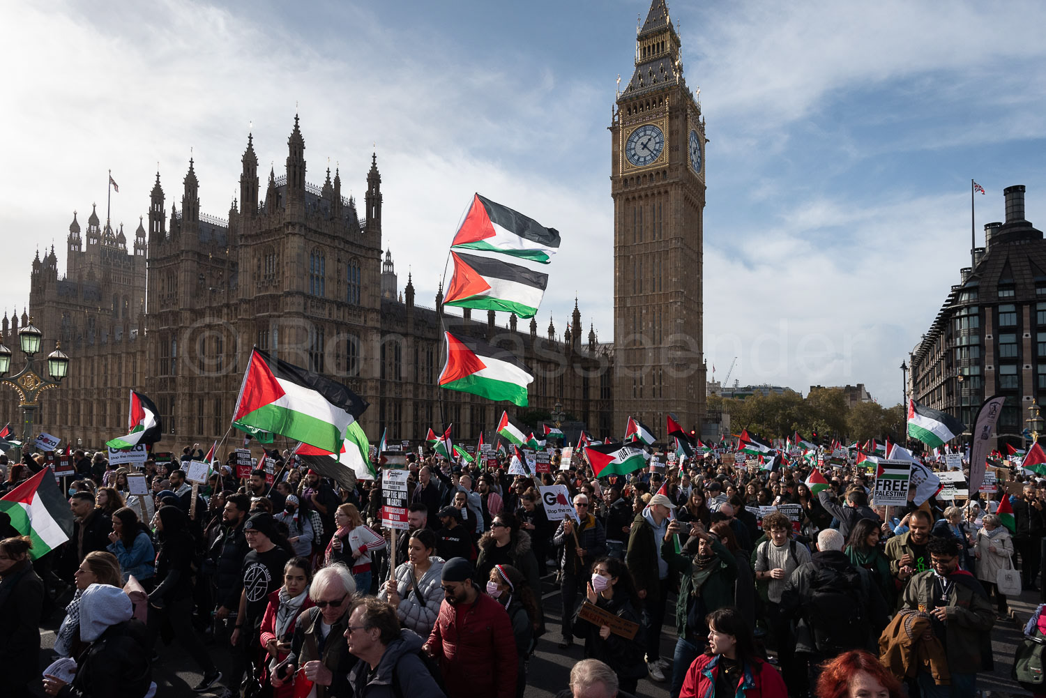 London, UK. 28 October, 2023. Over 100,000 Palestine supporters march through central London for the third consecutive Saturday demanding a ceasefire and an end to UK support of Israel's siege and war on Gaza which, UN agencies warn, faces a humanitarian disaster. Organised by a coalition including Palestine Solidarity Campaign, Friends of Al Aqsa, Stop the War Coalition and Muslim Association of Britain, the protest comes as Israel cuts off food, water and electricity and subjects Gaza to intense bombardment.