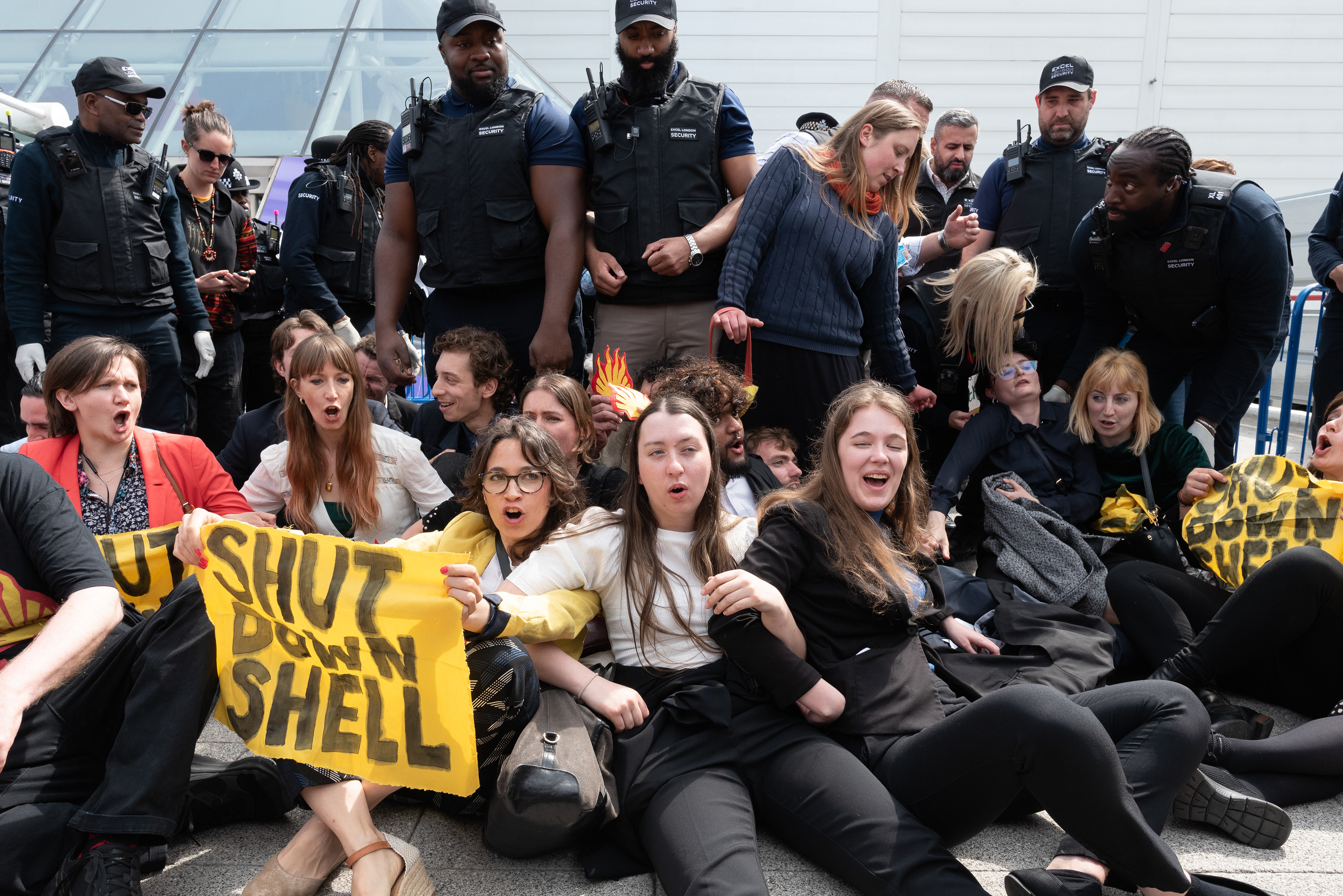A climate activist is removed from the Shell oil AGM at the Excel Centre. © Ron Fassbender