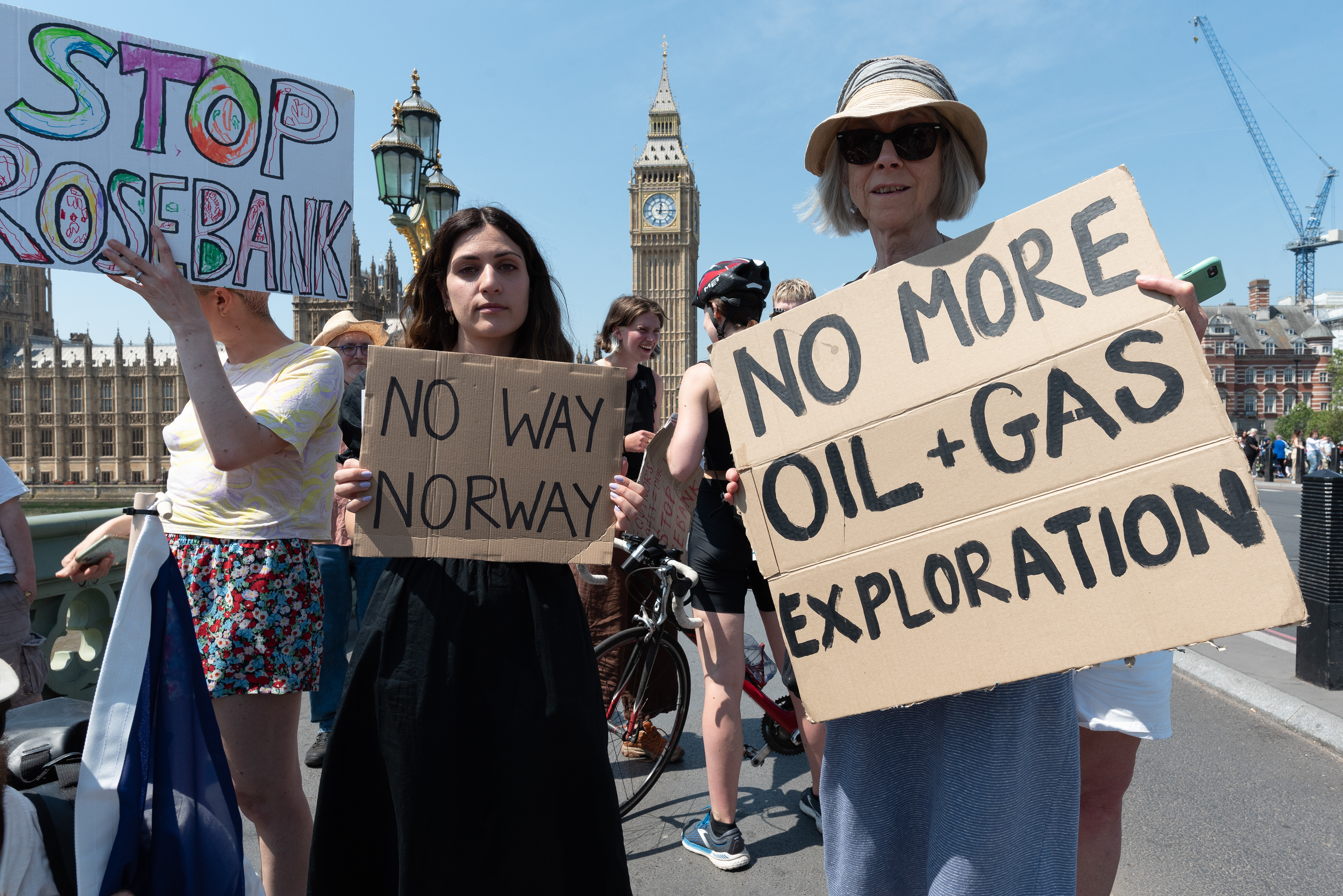 London, UK. 10 June, 2023. Protest against development of the Rosebank oil field by Norwegian state-owned oil company Equinor which, campaigners say, threatens climate targets and marine wildlife. Located 130 kilometres west of the Shetland Islands it is the biggest undeveloped oil field in the North Sea. The protest, one of many around the country, was organised by a coalition of climate and marine organisations including Friends of the Earth Scotland, Greenpeace UK, Oceana UK, Parents For Future UK, Sea Shepherd UK and Surfers Against Sewage.