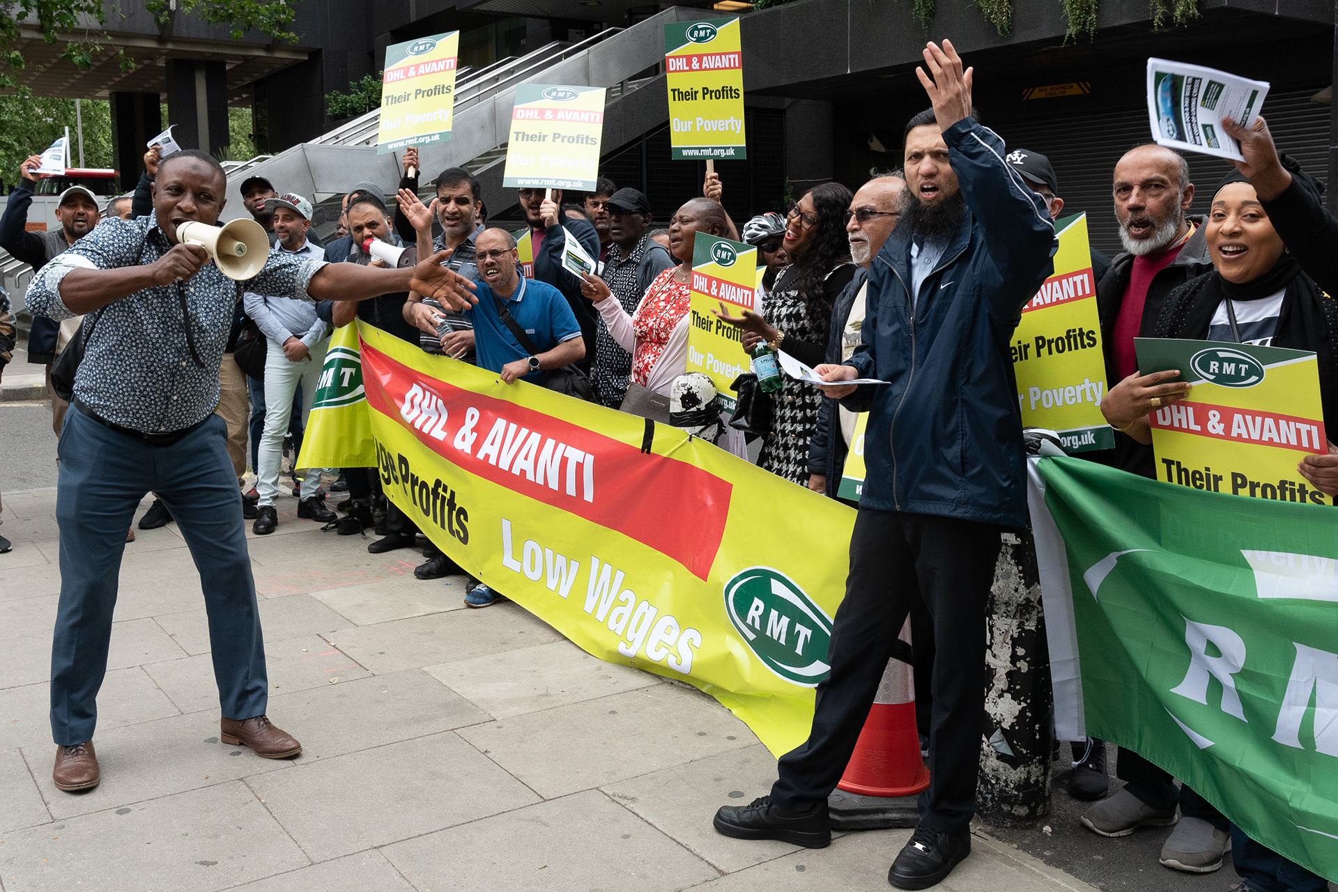 London, UK. 6 July, 2023. Striking RMT rail union members employed by contractor DHL, which provides catering stores for Avanti trains, hold a picket line at Euston station in a dispute over pay. Despite the cost of living crisis and high inflation the workers have not been offered a pay rise.