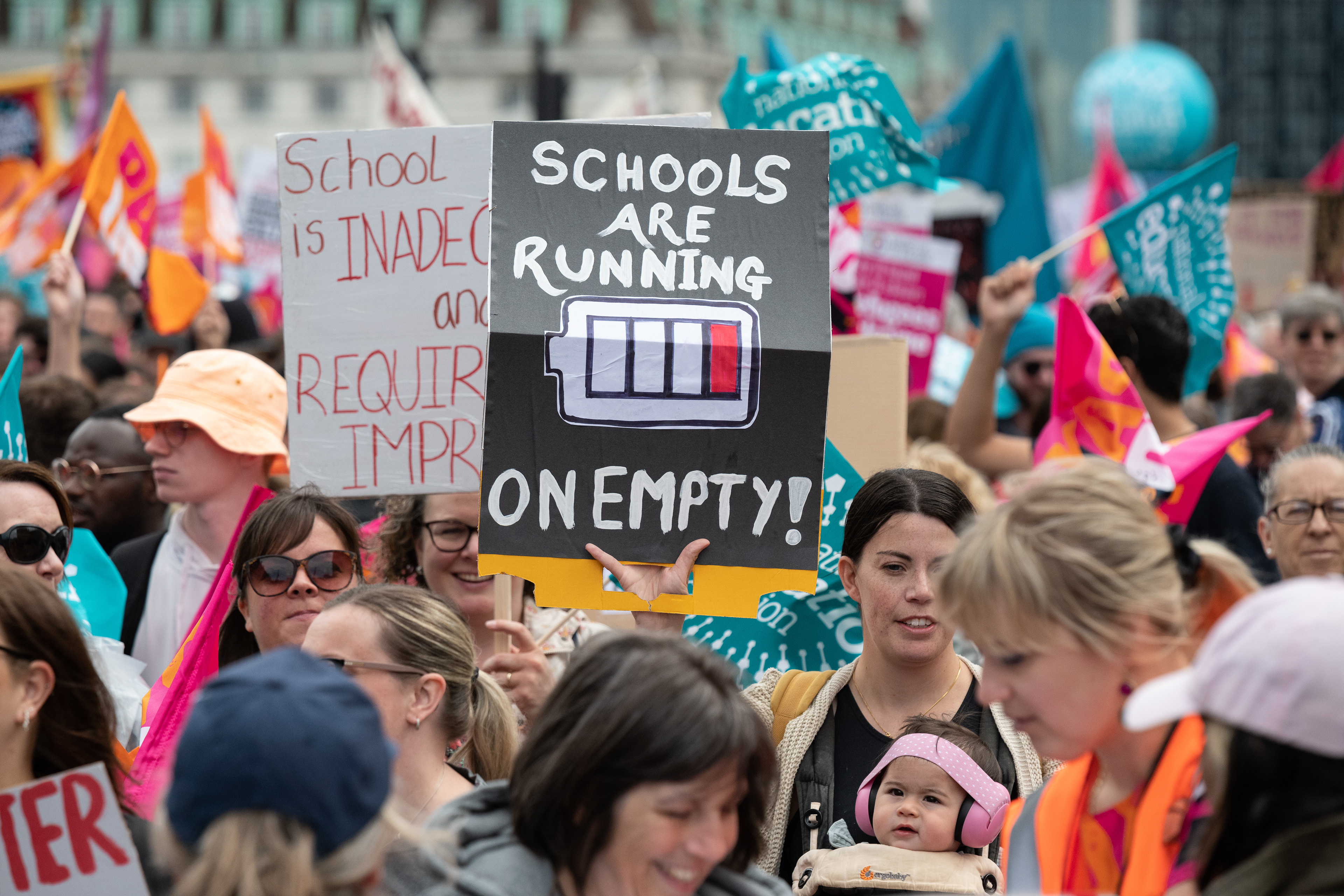London, UK. 5 July, 2023. Striking teachers from the National Education Union (NEU) hold a "Save Our Schools" march through central London to the Department for Education and Parliament Square calling for above-inflation pay rises and better funding for schools.